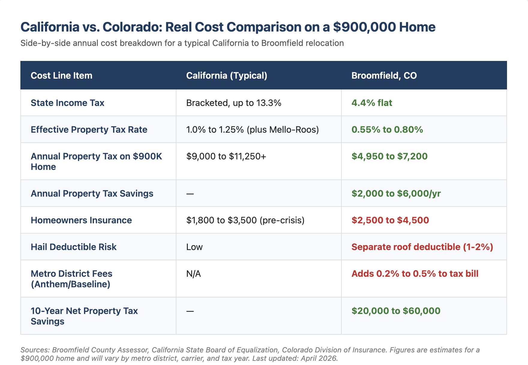 Will I actually save money moving from California to Colorado? Most California buyers save on housing and property tax, not income tax. Colorado's flat 4.4% state income tax is lower than California's bracketed system for high earners, but the bigger win is property tax: Broomfield's effective rate runs roughly 0.55% to 0.80%, while a typical California home runs 1.0% to 1.25% with Mello-Roos. On a $900,000 home, that's a difference of several thousand dollars a year, every year.