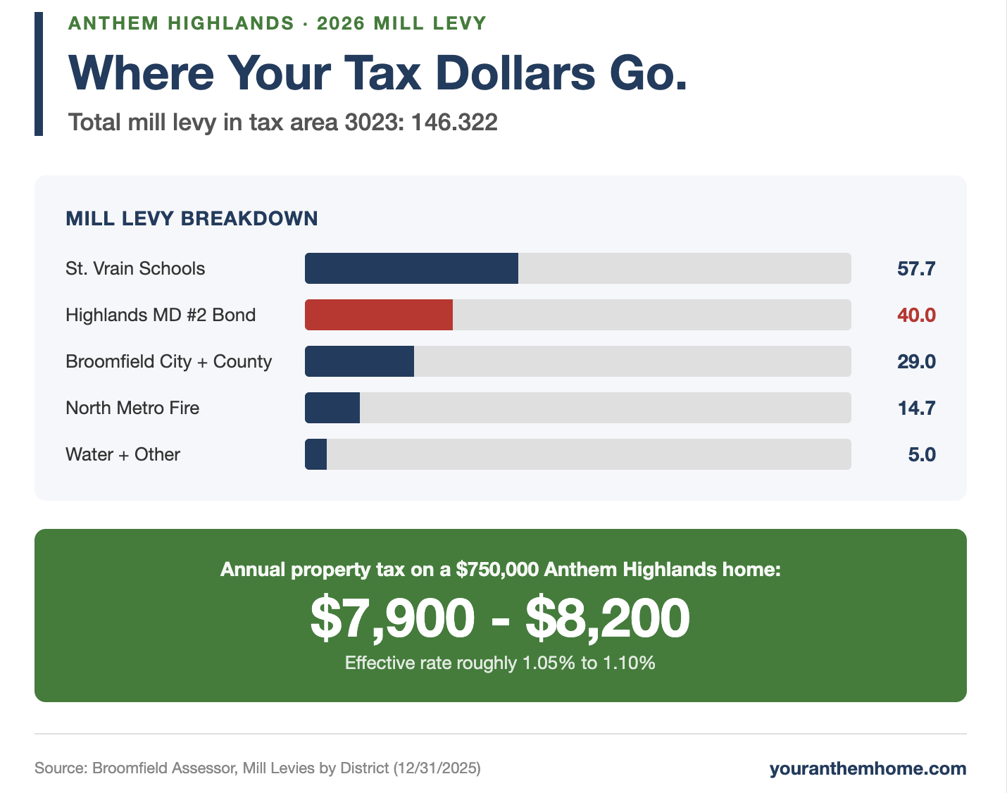 Anthem Highlands homeowners pay a total mill levy of 146.322 for 2026 collection, which includes a 40-mill Highlands Metro District #2 bond levy on top of standard Broomfield county, city, school, and fire mills. On a $750,000 home, that works out to roughly $7,900 to $8,200 per year, all in.