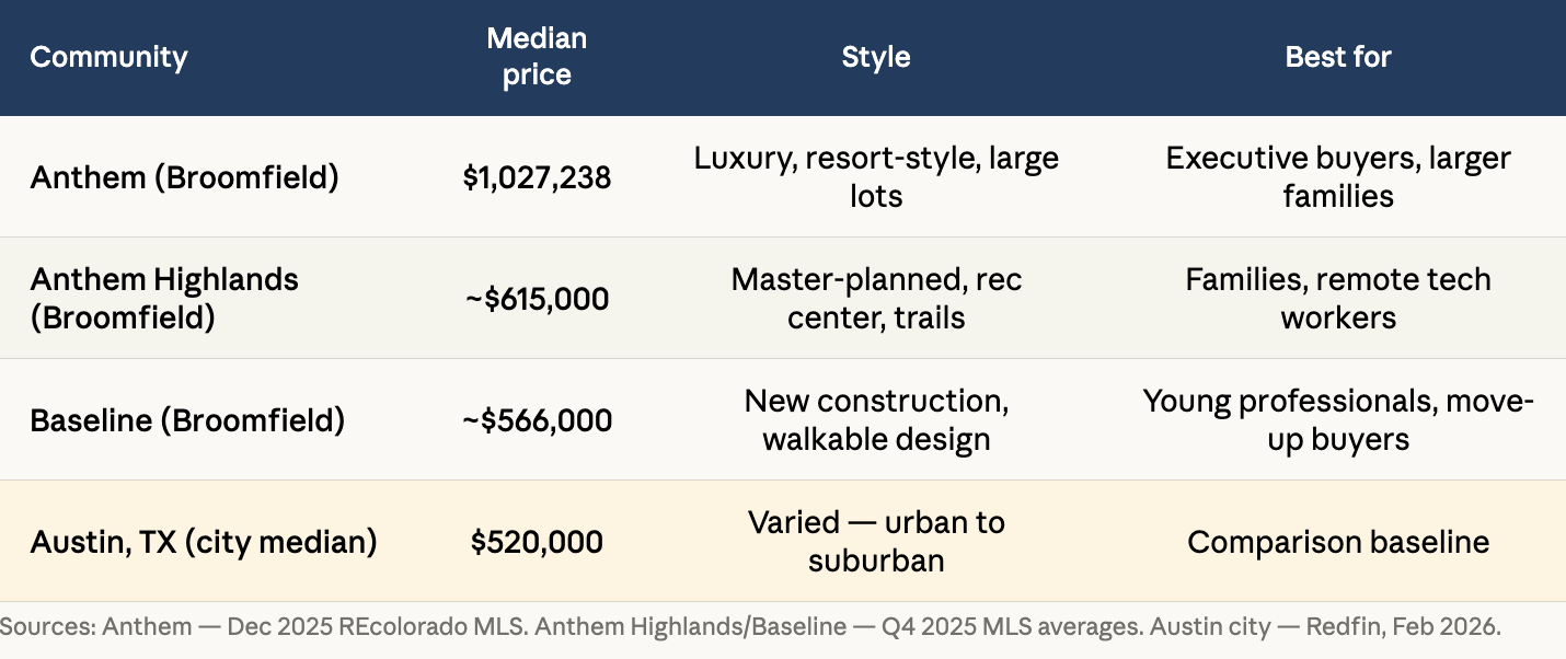 What are the best neighborhoods in Broomfield for Austin transplants? Austin transplants consistently gravitate toward Broomfield's three master-planned communities: Anthem (median $1,027,238 - luxury, resort-style), Anthem Highlands (average $615,000 - highly amenitized, family-focused), and Baseline (median $566,000 - newest community, modern walkable design). All three feel familiar to Austin-area suburban residents but add easy Rocky Mountain access that Central Texas simply cannot match.