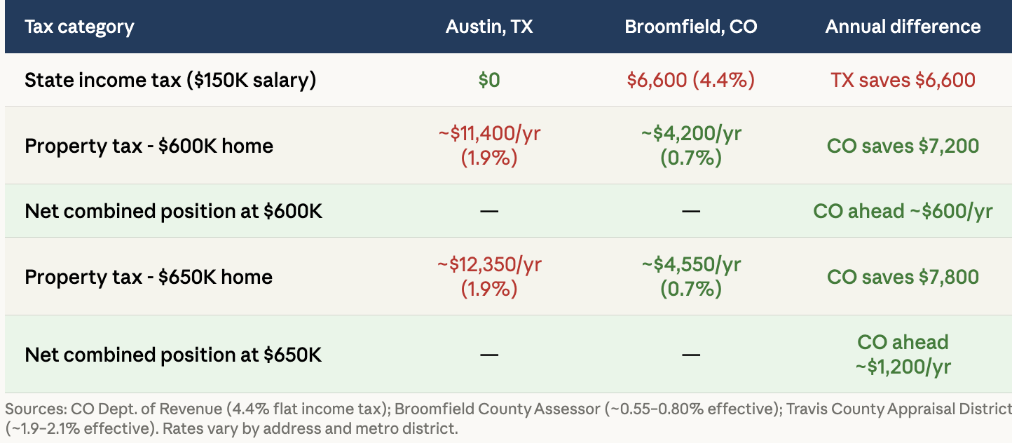 Does moving from Austin to Denver cost more in taxes? Texas has no state income tax, while Colorado charges a flat 4.4%. On a $150,000 salary, that is $6,600 more per year in Colorado. However, Colorado's property tax rates are dramatically lower. On a comparable $560,000 home, you would pay roughly $3,920/year in Broomfield (0.7%) versus $10,640/year in Austin (1.9%) - a property tax savings of $6,720 that nearly offsets the income tax difference entirely. The higher the home value, the more Colorado's property tax advantage grows.
